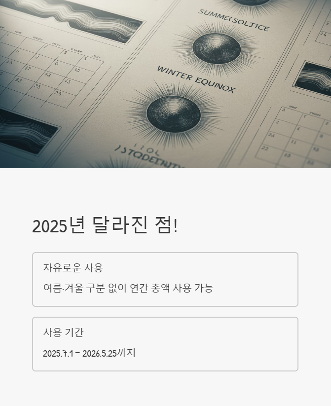 ✅ 네! 2025년부터는 연간 총 지원금을 여름부터 겨울까지 자유롭게 쓸 수 있습니다. 하절기에 요금 차감을 원치 않으시면 '하절기 요금 미차감' 신청을 해서 동절기에 전액을 사용하실 수도 있습니다.