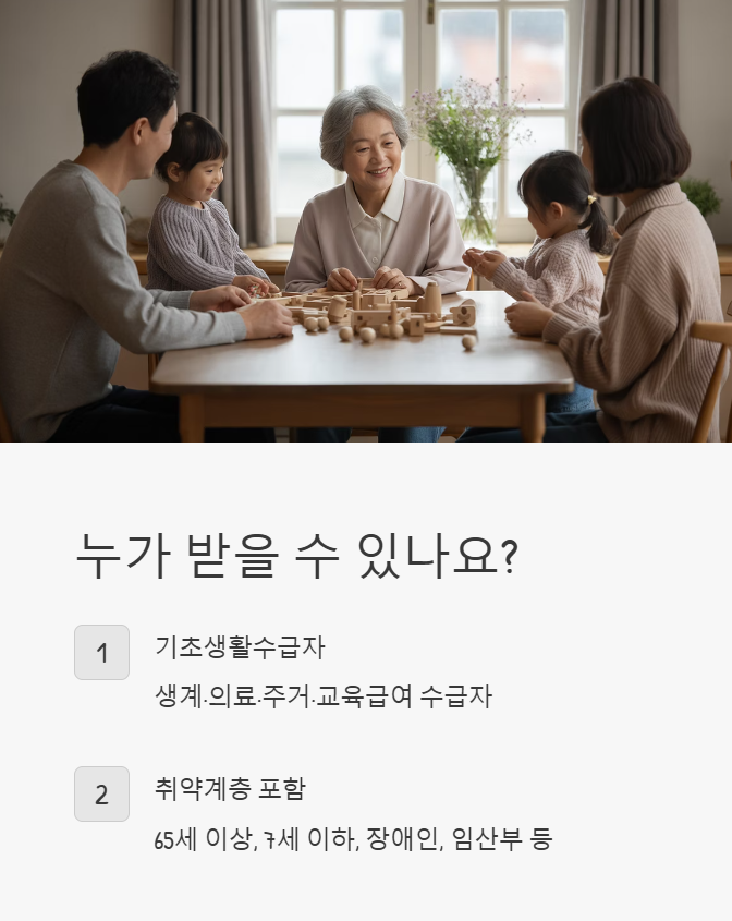 • 모든 세대원이 요양원 등 시설에 계신 경우: 집이 아닌 시설에서 보살핌을 받고 있다면 지원 대상이 아닙니다.