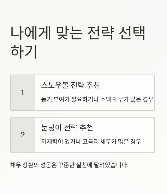 - 스노우볼 vs 눈덩이 전략은 상환 의지를 돕는 도구입니다.