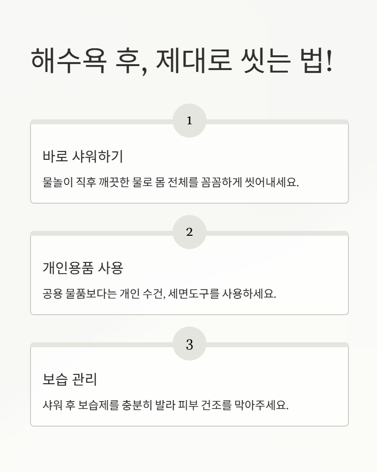 특히 아토피성 피부염이 있다면 염소 성분이나 바닷물로 인해 피부가 더 자극받을 수 있으니, 더더욱 깨끗이 씻는 게 중요해요.