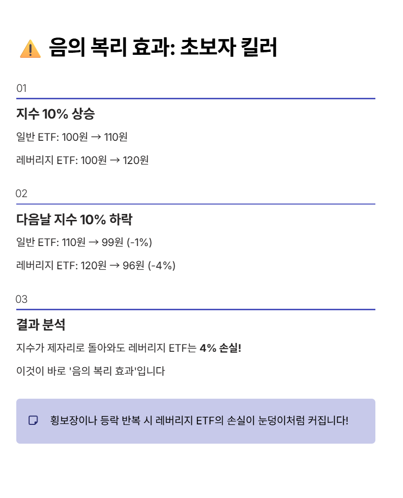 - 레버리지 ETF: 100원에서 120원이 되었다가 96원이 됩니다. (-4%)