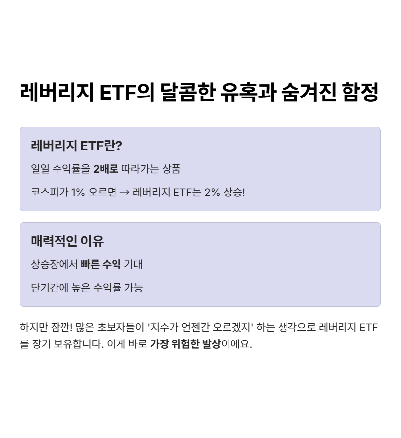 | 📋 레버리지 ETF 투자 전 체크리스트 ✅ 단기적인 시장 상승을 예상하는가? ✅ '음의 복리 효과'의 위험성을 아는가? ✅ 장기 투자가 아닌 단기 투자 원칙을 지킬 수 있는가? |