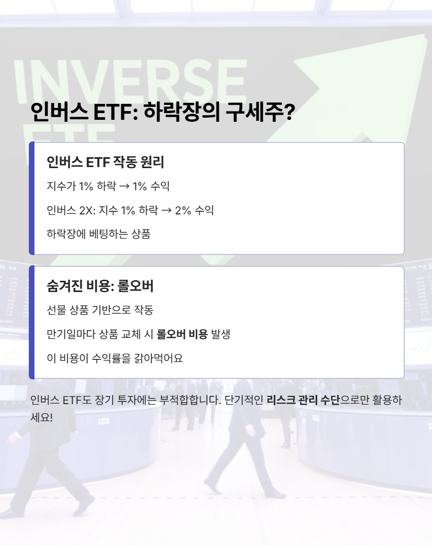 | 📋 인버스 ETF 투자 전 체크리스트 ✅ 이 상품이 선물 거래를 기반으로 한다는 것을 아는가? ✅ 만기 비용인 '롤오버 비용'에 대해 아는가? ✅ 내 포트폴리오를 위한 단기적인 위험 관리 목적으로만 사용할 것인가? |