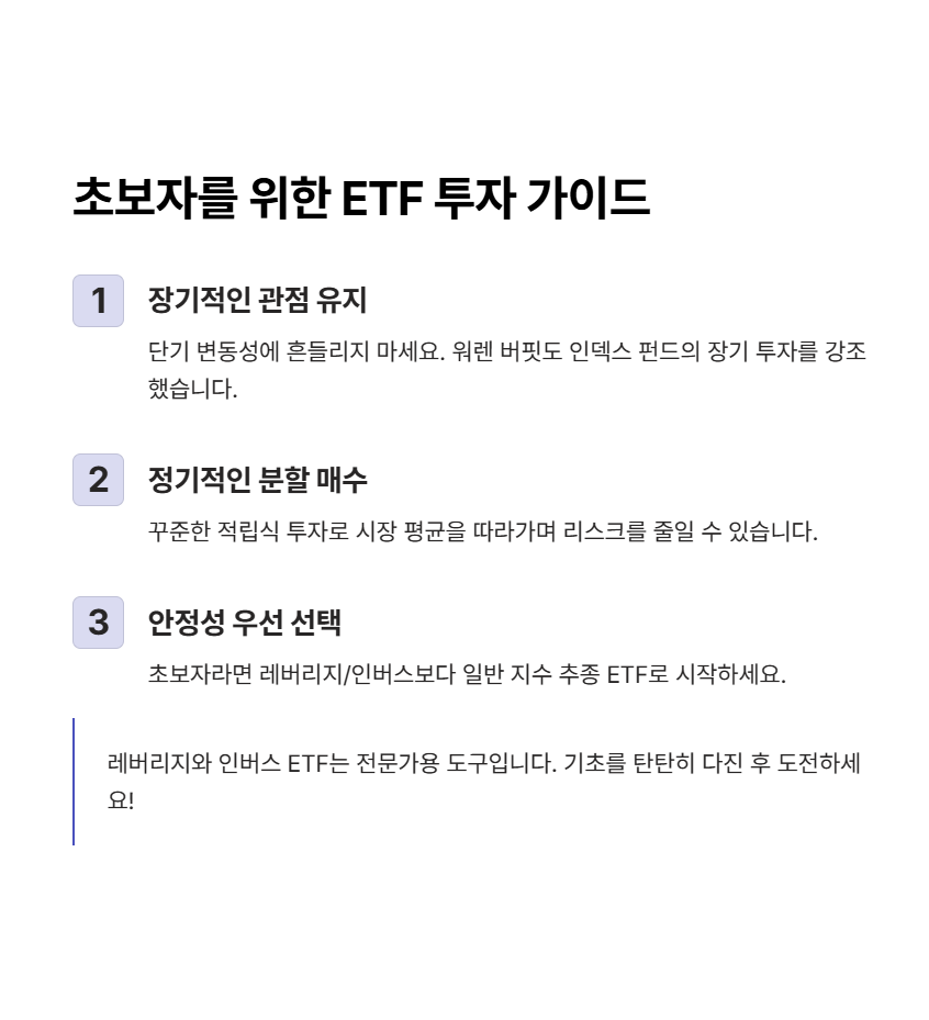 - ✔ 안정성 우선: 초보자라면 레버리지/인버스보다 일반 지수 추종 ETF로 시작하는 것을 추천해요.