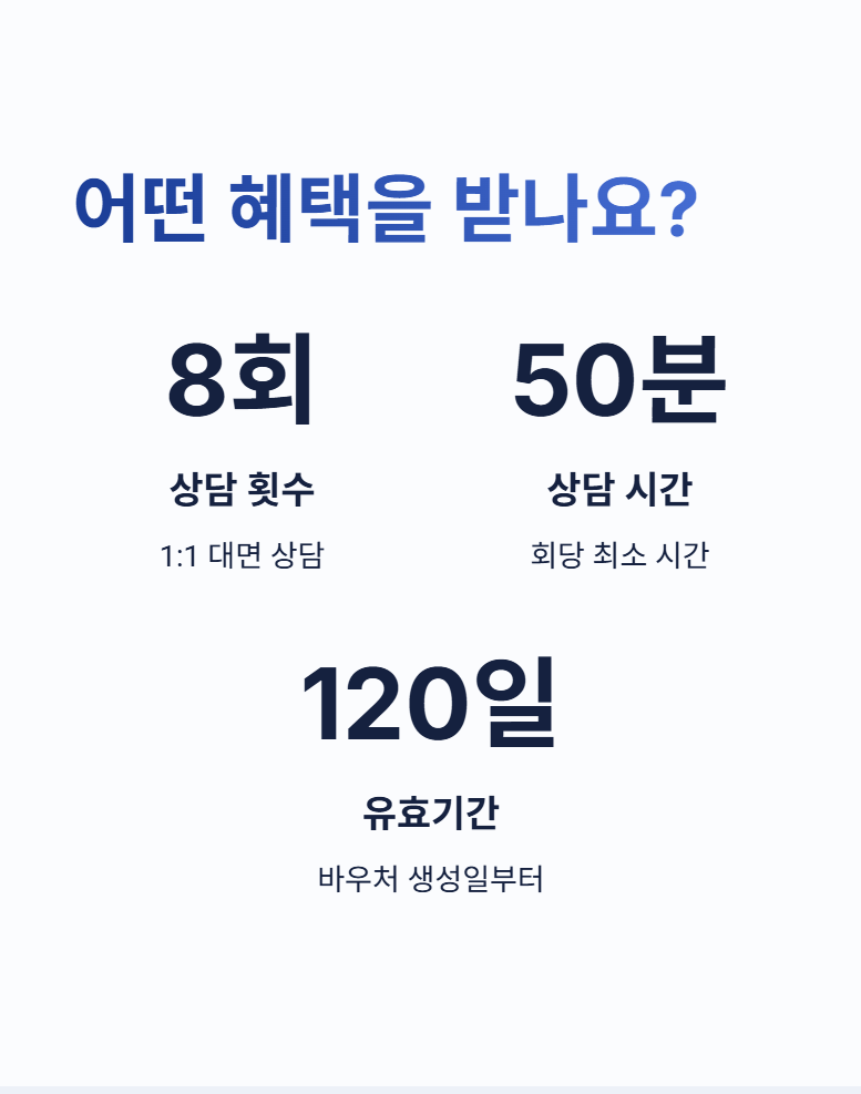 - 상담 횟수: 총 8회의 1:1 대면 상담을 받을 수 있습니다.