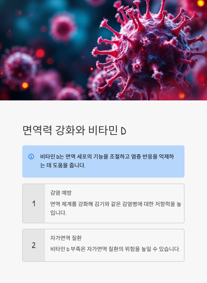 비타민 D는 면역 세포의 기능을 조절하고 염증 반응을 억제하는 데 도움을 줘요. 부족하면 감염에 취약해지고 자가면역 질환의 위험도 높아질 수 있답니다.