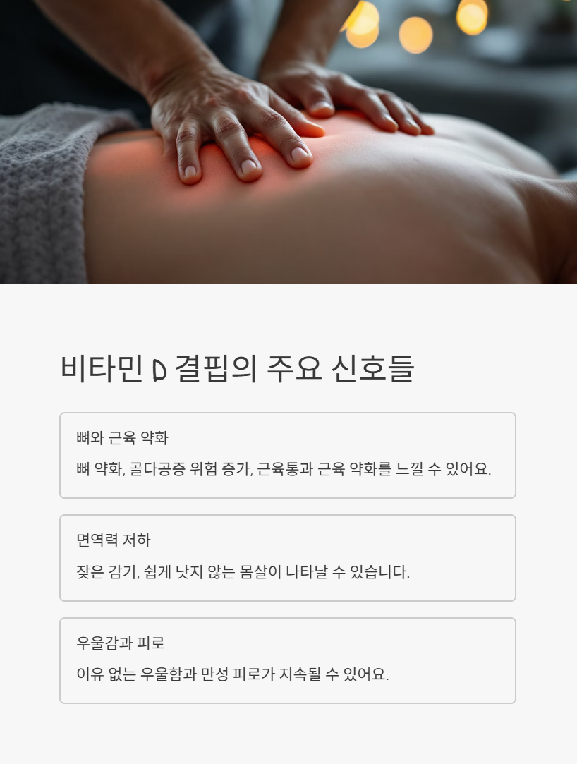 오늘 이 글 하나면 여러분도 내 몸이 보내는 작은 신호들을 놓치지 않고 비타민 D 부족을 바로 알아차릴 수 있을 거예요.