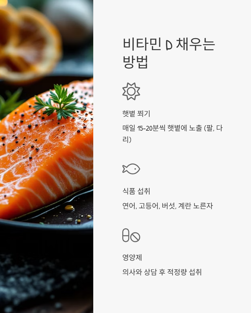 ✅ **비타민 D 풍부한 음식 섭취**: 연어, 고등어, 버섯, 계란 노른자