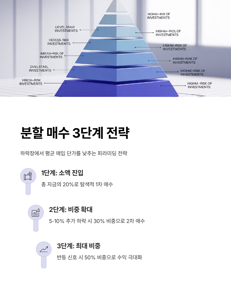 분할 매수는 투자금을 한 번에 진입할 때 발생할 수 있는 리스크 집중을 막아주는 안전장치입니다. 특히 변동성이 큰 시장에서 매우 유리한 전략입니다.