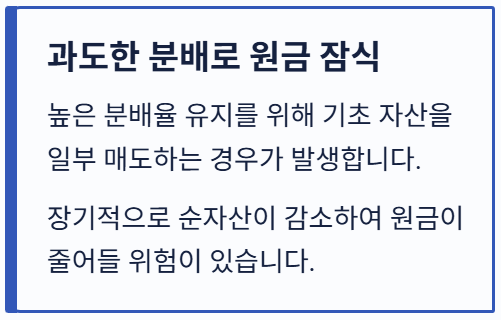 ✅ 분배율 적정성: 연 10~12%를 넘는 초고분배율은 원금 잠식 위험이 높습니다.