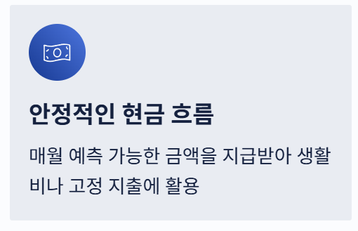 - 안정적인 현금 흐름: 매월 예측 가능한 금액을 지급받아,