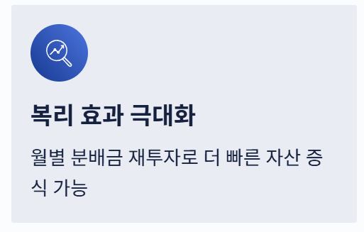 은퇴 생활비나 고정 지출 보조금으로 활용하기 좋습니다. - 복리 효과 극대화: 월별로 받은 분배금을 재투자하면,