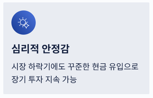 분기/연간 배당보다 더 빠르게 자산이 불어나는 복리 효과를 누릴 수 있습니다. - 심리적 안정감: 시장이 하락할 때도 매월 꾸준히 현금이 들어오기 때문에,