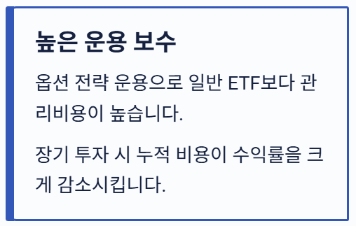 월배당 ETF는 옵션 운용 등 복잡한 전략을 사용하기 때문에 일반 ETF보다 관리비용(보수)이 높습니다.