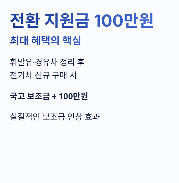 2026년 전기차 보조금은 구조가 크게 바뀌며, 내연기관차를 전기차로 교체할 경우 ‘전환 지원금 100만 원’이 새롭게 추가됩니다. 변화한 지원 기준과 핵심 포인트를 한눈에 정리합니다.