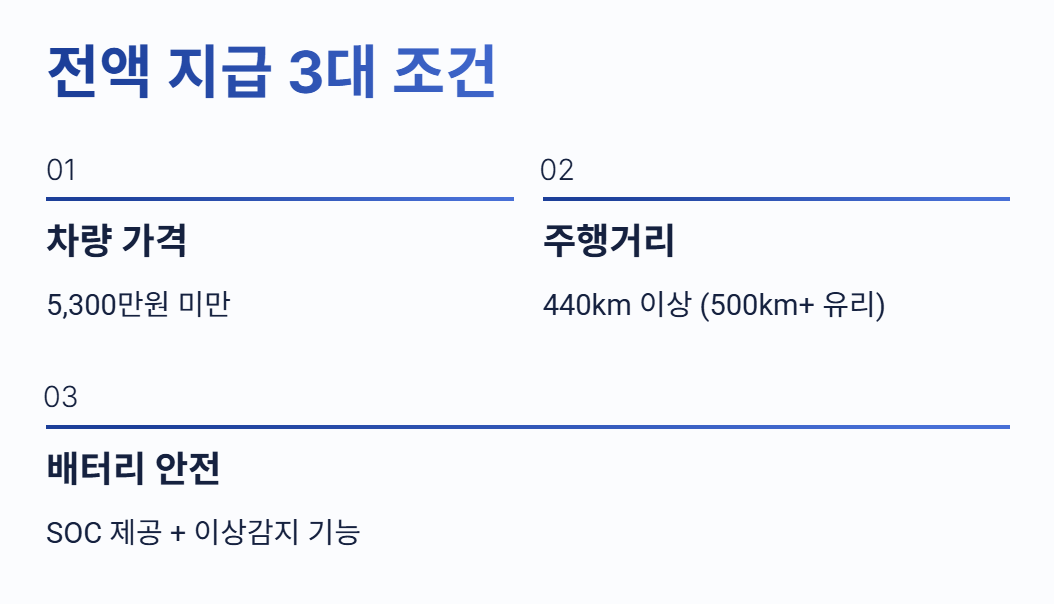 또한 차량 가격 상한선, 주행거리 기준, 배터리 안전 요건 등 보조금 전액 지급을 위한