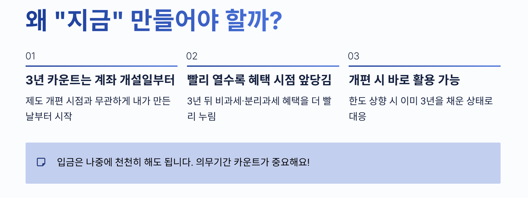 계좌를 빨리 열어둘수록 3년 뒤 혜택을 실제로 사용하는 시점이 앞당겨지고, - 나중에 개편이 실제로 시행됐을 때도