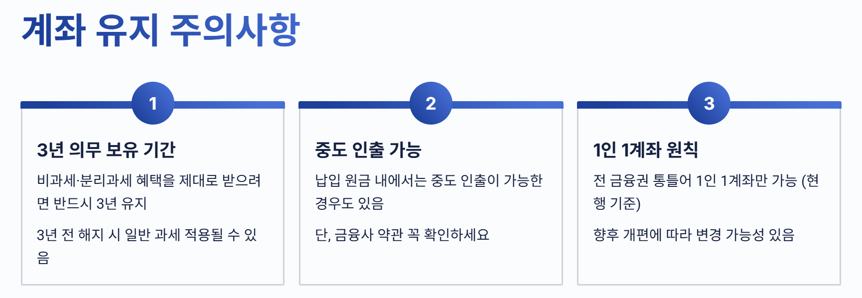 - 3년 의무 보유 기간을 채워야 비과세·분리과세 혜택을 제대로 적용받을 수 있어요.