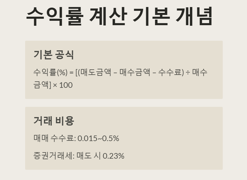 수익률 (%) = [(매도금액 – 매수금액 – 수수료) ÷ 매수금액] × 100