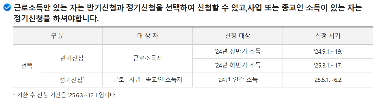 • 대상: 2024년 연간 소득에 대해 신청 (근로소득, 사업소득, 종교인소득 모두 포함)