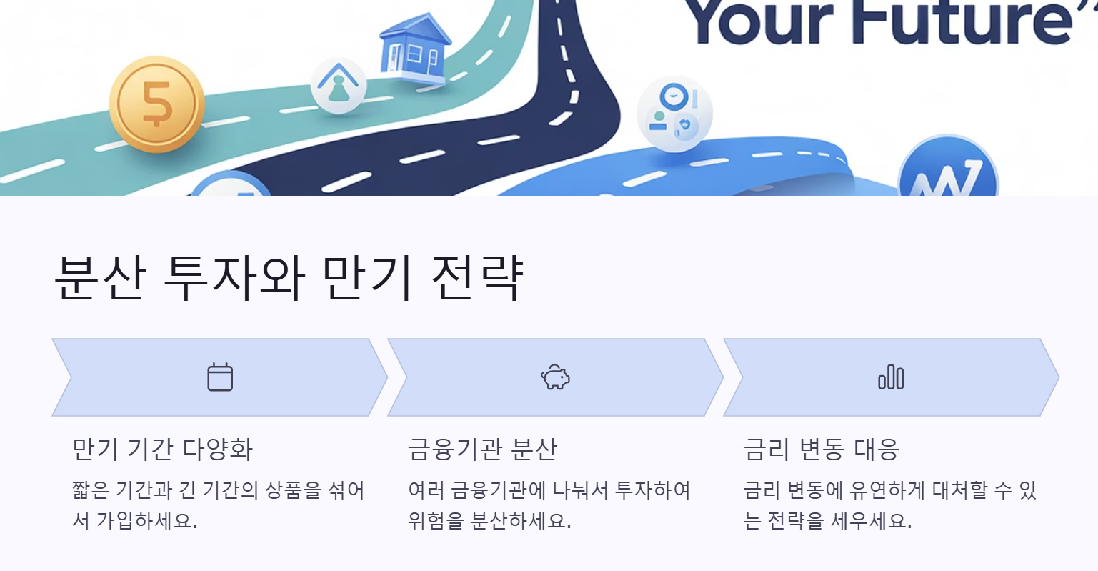 - 돈을 나눠서 안전하게 관리하세요: 돈을 여러 곳에 분산하고, 만기도 다양하게 조절하여 위험을 줄이고 수익을 늘리는 현명한 전략을 세우세요.