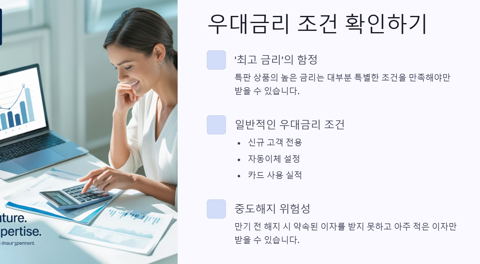 '최고 금리'라는 말에 혹해서 바로 가입하면 안 됩니다. 특판 상품의 높은 금리는 대부분 특별한 조건을 만족해야만 받을 수 있습니다. 예를 들어, 새로운 고객이거나, 자동 이체를 걸거나, 카드를 많이 사용해야 하는 등의 조건이 있습니다. 내가 이 조건을 모두 채울 수 있는지, 그래서 실제로 얼마나 이자를 받을 수 있는지 꼭 미리 계산해 봐야 합니다. 또한, 갑자기 돈이 필요해서 중간에 예금이나 적금을 깨게 되면 약속된 이자를 다 받지 못하고 아주 적은 이자만 받을 수 있으니, 만기까지 돈을 묶어둘 수 있는지 신중하게 생각해야 합니다.