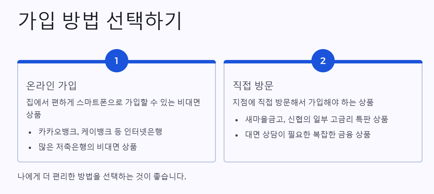 요즘은 집에서 편하게 스마트폰으로 가입할 수 있는 비대면 상품이 많습니다. 카카오뱅크나 케이뱅크 같은 인터넷은행은 물론, 많은 저축은행들도 비대면 가입을 지원합니다. 하지만 새마을금고나 신협의 일부 고금리 특판 상품은 여전히 지점에 직접 방문해서 가입해야 하는 경우가 많습니다. 어떤 방식으로 가입해야 하는지 미리 확인하고, 나에게 더 편리한 방법을 선택하는 것이 좋습니다.