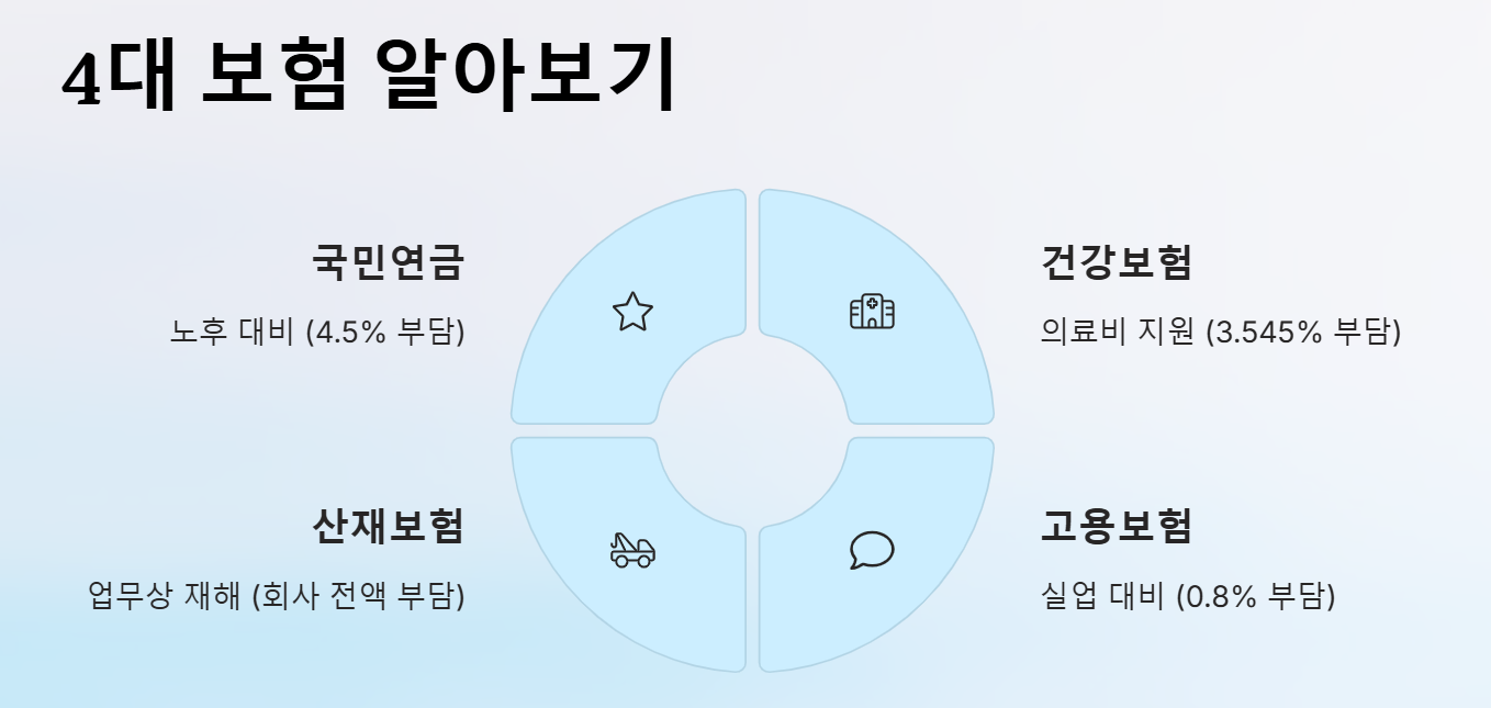 • 4대 보험: 국민의 건강과 노후, 실업 등 사회적 위험에 대비하기 위한 사회 안전망입니다. 회사와 내가 함께 돈을 내서 서로를 돕는 시스템입니다.