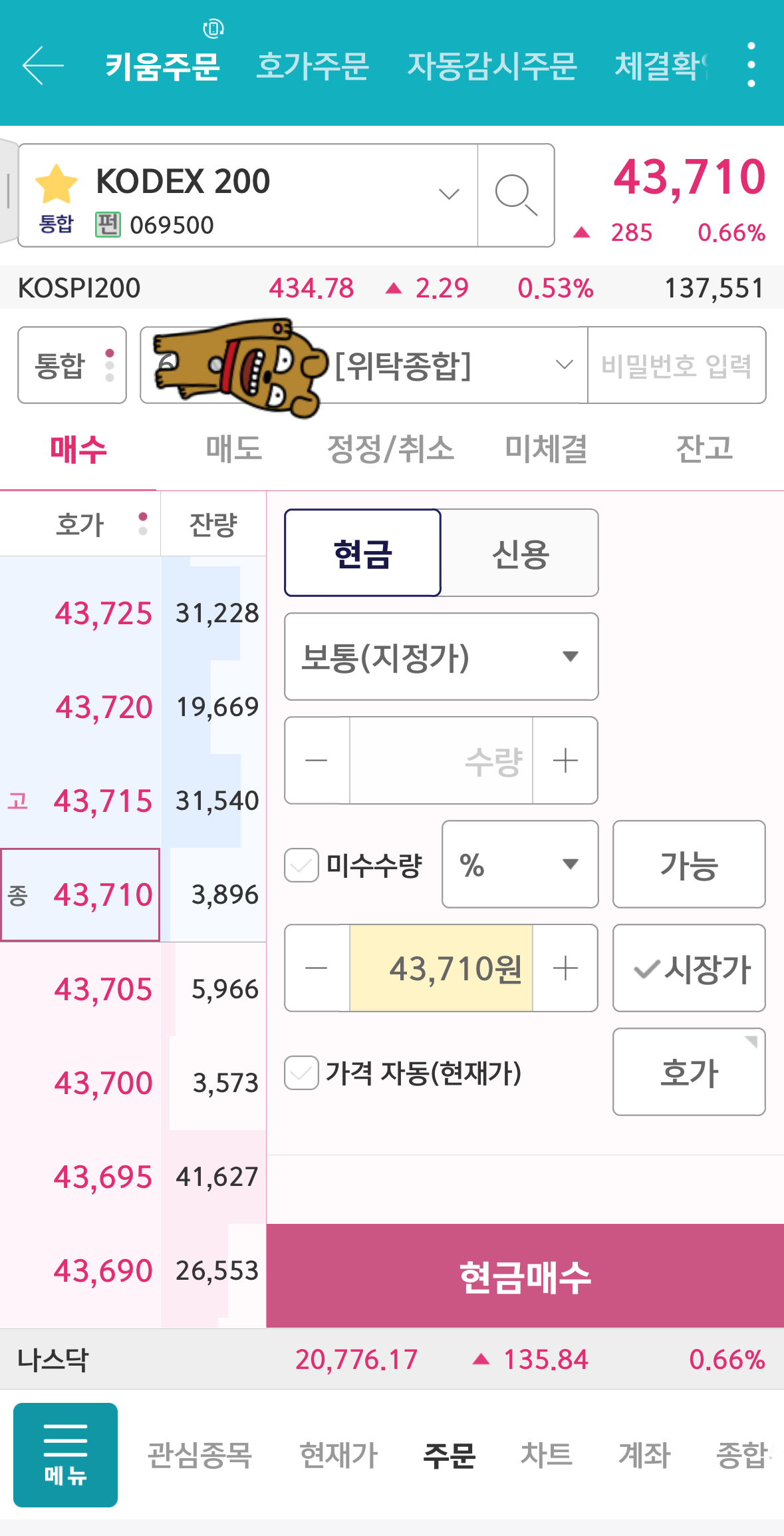 예를 들어, 현재가 43,710원에 3,896주가 거래 대기 중이라는 것을 알 수 있습니다.