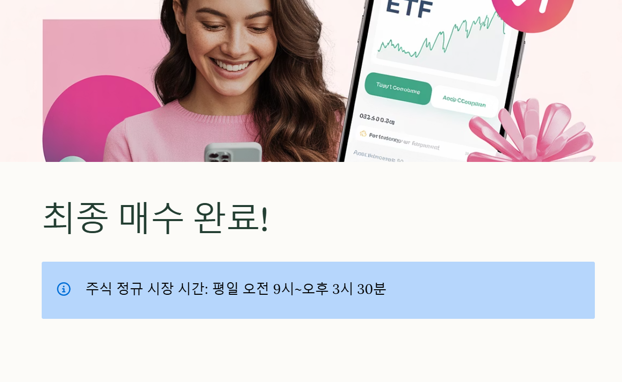 이제 모든 정보를 입력하고, '현금매수' (빨간색 큰 버튼) 버튼을 누르면 ETF 매수가 완료됩니다!